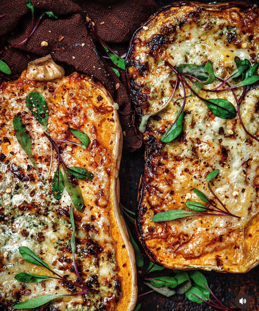 A vibrant vegetarian main that’s as beautiful as it is delicious. Roasted butternut squash halves are filled with a savoury mixture of wilted spinach, aromatic pesto, and creamy cheese—perfect for a cosy dinner.
