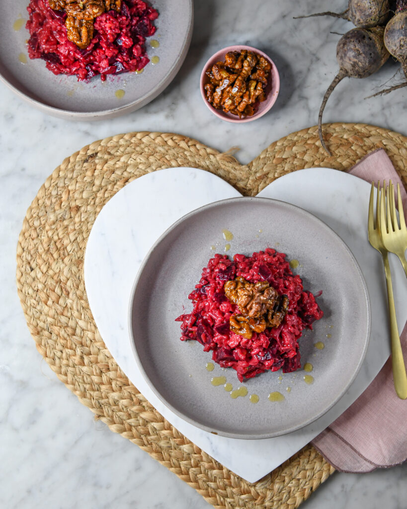 A vibrant Valentine’s risotto with earthy beetroot, creamy mascarpone, and bright citrus notes, finished with truffle oil and candied walnuts.
