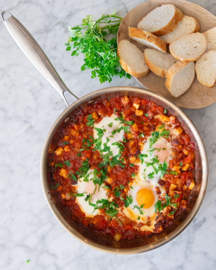 Savour vibrant spiced tomato and bell pepper sauce with golden halloumi cubes and gently oven-poached eggs, garnished with fresh parsley. Served with crusty bread.