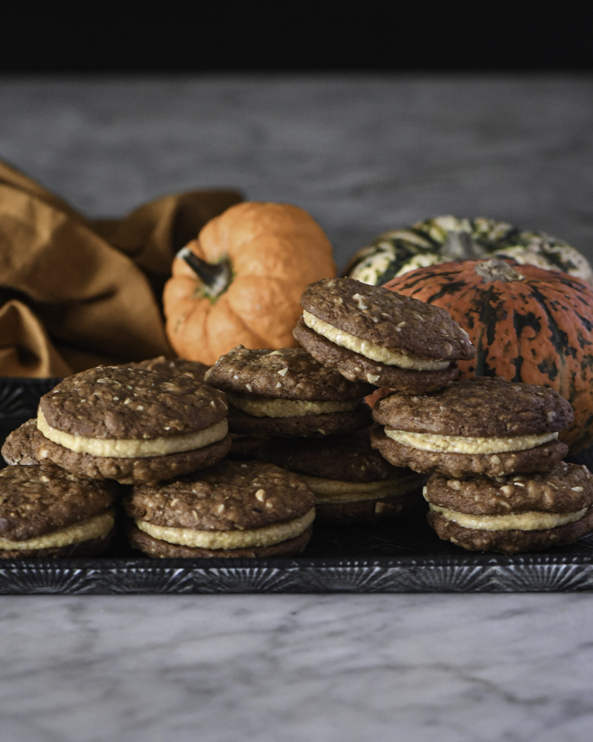 Soft, chewy autumn cookies with warming spices, toasted hazelnuts, and sweet pumpkin cream filling Ingredients: For the cookies: For the pumpkin cream filling: Method: Toast the hazelnuts: Make the cookies: Make the pumpkin cream: Assemble the sandwiches: