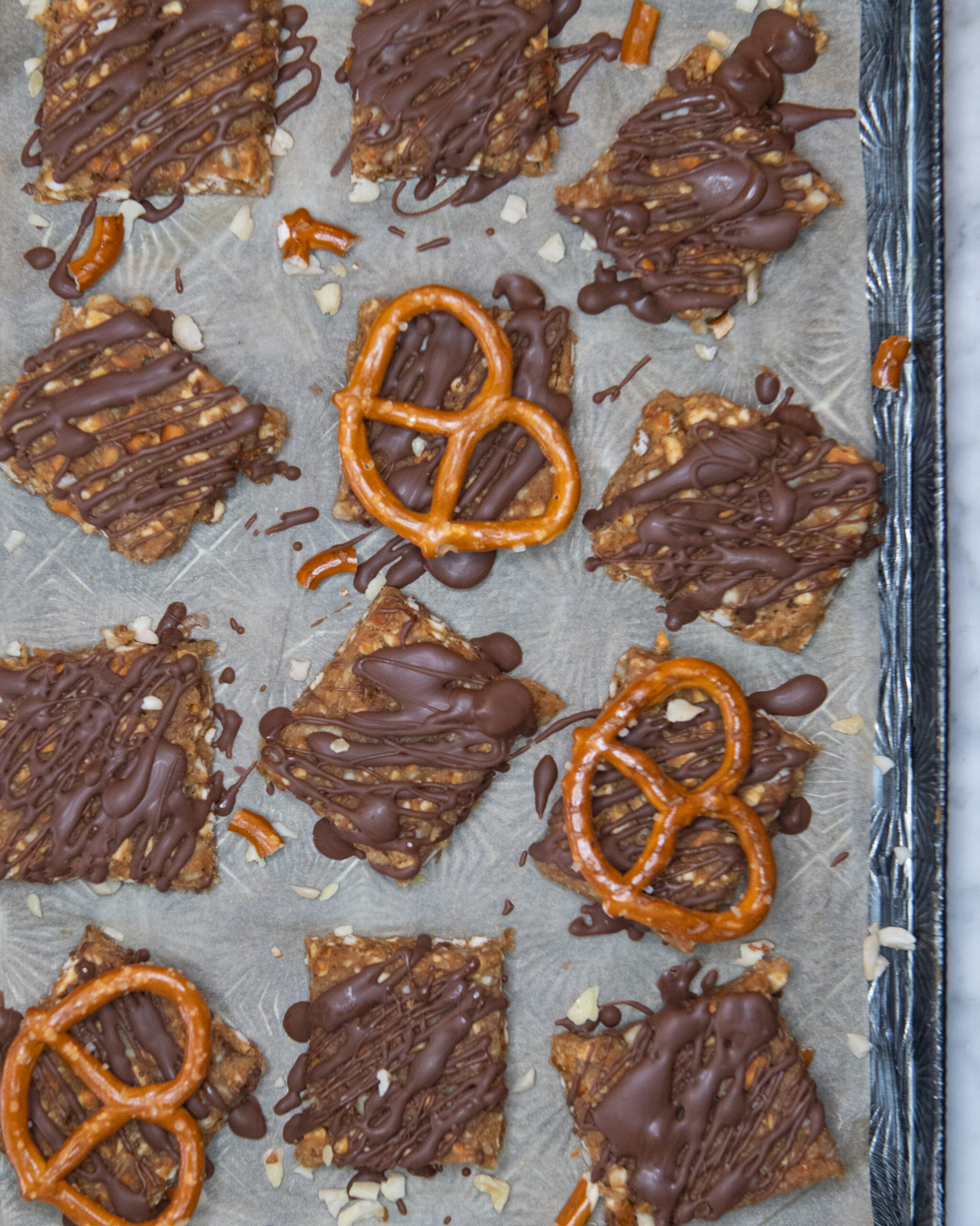 Crunchy, sweet, and salty squares combining pretzels, peanut butter, banana, nuts, and a smooth milk chocolate drizzle. Ingredients Method: